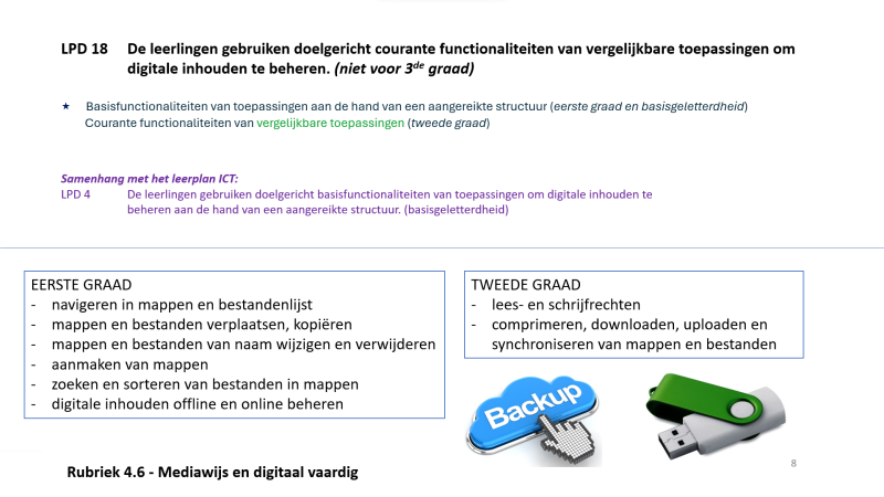 LPD 18 -> De leerlingen gebruiken doelgericht courante functionaliteiten van vergelijkbare toepassingen om digitale inhouden te beheren.
