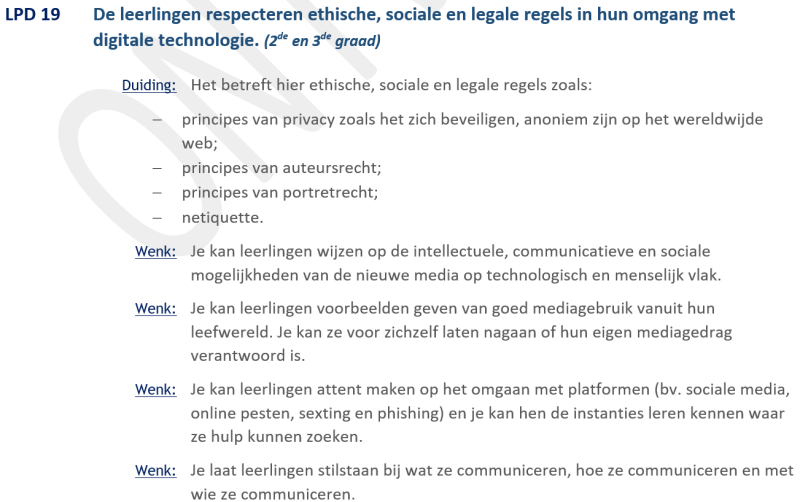 • LPD 19 De leerlingen respecteren ethische, sociale en legale regels in hun omgang met digitale technologie. (2de en 3de graad)